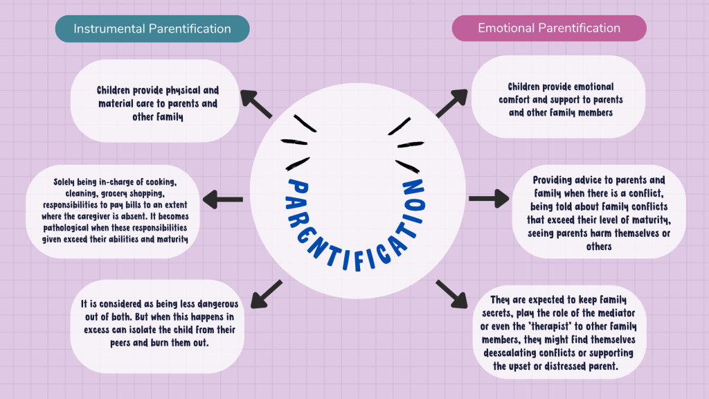 Instrumental Parentification happens when children are assigned tasks like paying bills, looking after household chores, and running errands. When these tasks are paired with words of encouragement and praise, it can instill a sense of accomplishment and enable one to learn skills that would help in adulthood. But in households where caregivers have medical needs or are absent, it can create an environment where the child becomes the ‘adult’. In such situations, words of affirmation and praise are also missing.